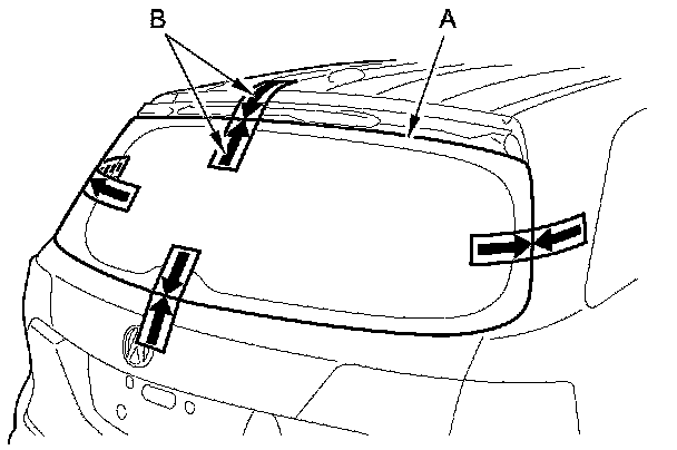 14. Set the rear window (A) in the opening, and center it. Make alignment marks (B) across the rear window and body with a grease pencil at the four points shown. Be careful not to touch the rear window where adhesive will be applied.