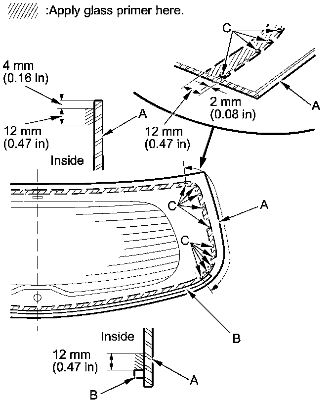- With the printed dots (C) on the rear window as a guide, apply the glass primer to both side portions of the rear window.
