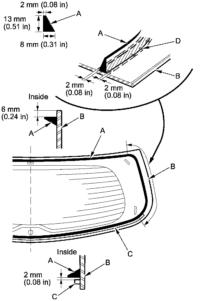 18. Pack adhesive into the cartridge without air pockets to ensure continuous delivery. Put the cartridge in a caulking gun, and run a bead of adhesive (A) on the rear window (B) around the edge of the lower rubber dam (C) as shown. With the printed dots (D) on the rear window as a guide, apply the adhesive to both side portions of the quarter glass.