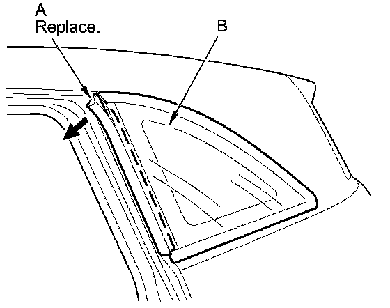 3. Remove the front seal (A) from the front edge of the quarter glass (B). If necessary, cut the front seal with a utility knife.