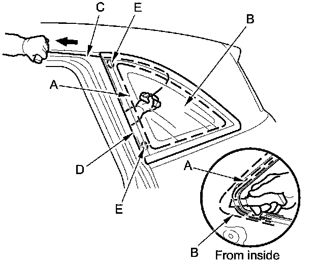 16. Pack adhesive into the cartridge without air pockets to ensure continuous delivery. Put the cartridge in a caulking gun, and run a bead of adhesive (A) around the edge of the front seal (B) and the molding (C) as shown. With the glass primer (D) you applied in step 13on the quarter glass (E) as a guide, apply the adhesive to the upper and lower corner portions of the quarter glass. Apply the adhesive within 30 minutes after applying the glass primer. Make a slightly thicker bead at each corner.
