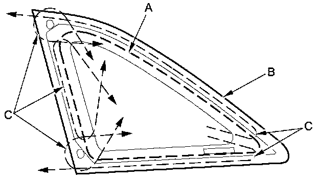 4. Carefully cut through the adhesive (A) at the rear corner portion of the quarter glass (B) with a utility knife. With a helper on the outside, pull the piano wire (C) back and forth in a sawing motion. Hold the piano wire as close to the quarter glass as possible to prevent damage to the body, and carefully cut through the adhesive around the entire quarter glass: