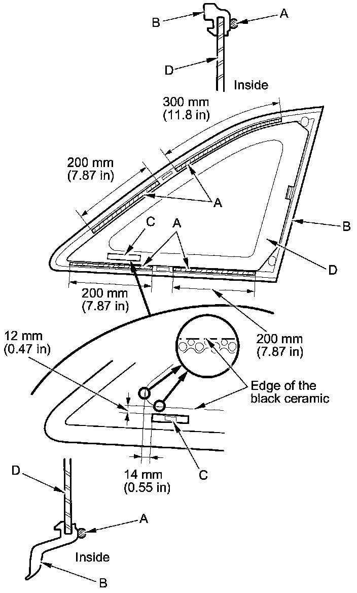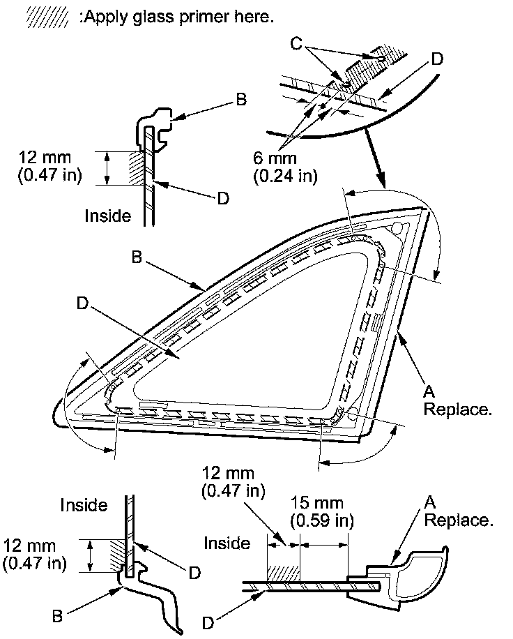 - With the printed dots (C) on the quarter glass (D) as a guide, apply the glass primer to the front portion of the quarter glass.