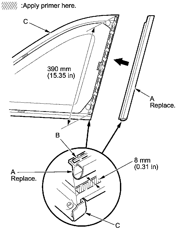 13. With a sponge, apply a light coat of glass primer along the edge of the front seal (A) and the molding (B) as shown, then lightly wipe it off with gauze or cheesecloth: