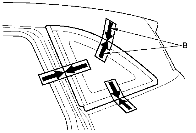 11. If the old quarter glass will be reinstalled (and either clip is broken off the molding), seal the body holes with pieces of urethane tapes (A). Then set the quarter glass upright in the opening, and make alignment marks (B) across the quarter glass and body with a grease pencil at the three points shown. Be careful not to touch the quarter glass where adhesive will be applied.
