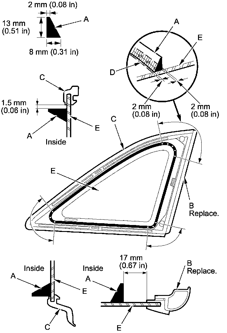 - If the molding is damaged, replace the quarter glass, molding, and clips (E) as an assembly.