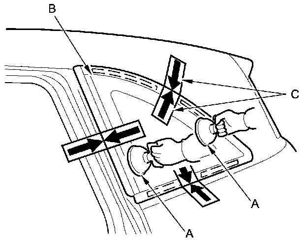 17. Use suction cups (A) to hold the quarter glass (B) over the opening, align the clips or the alignment marks (C) made in step 11, and set it down on the adhesive. Lightly push on the quarter glass until its edges are fully seated on the adhesive all the way around.