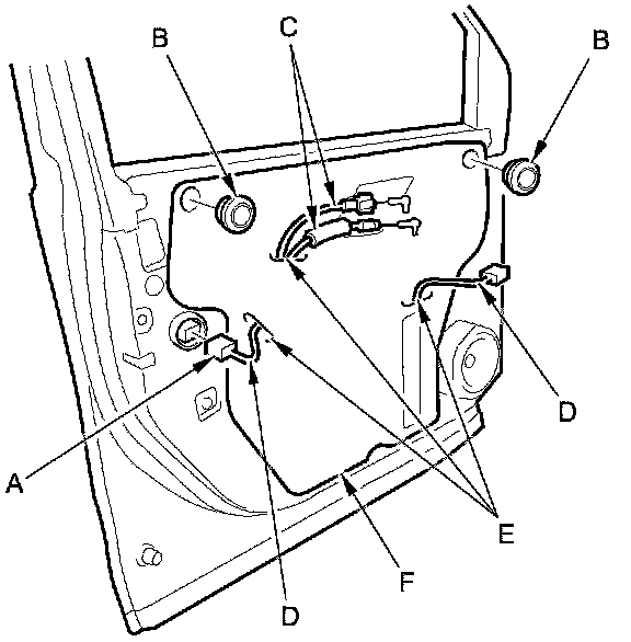 2. Disconnect the power door lock actuator connector (A), and remove the plug caps (B).