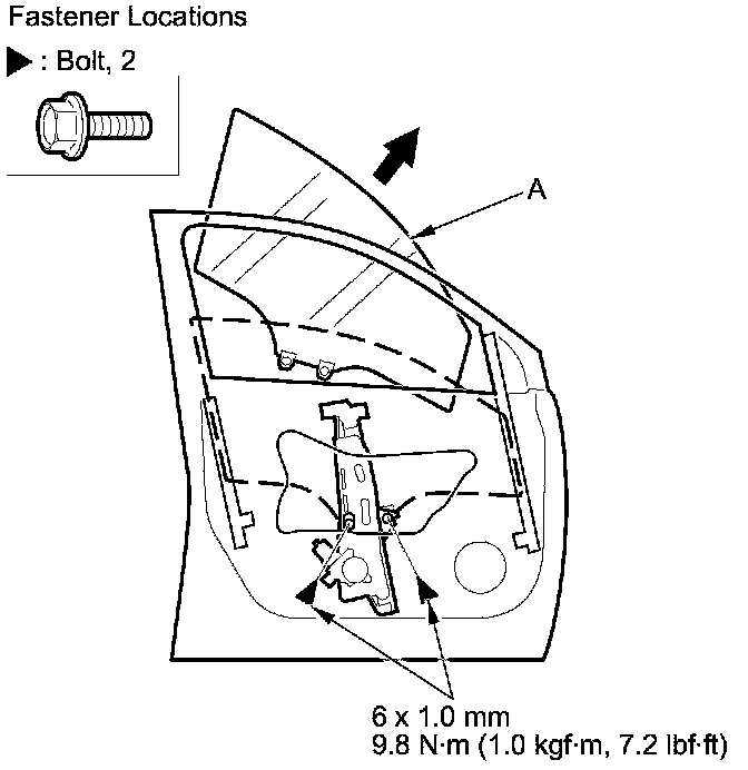 4. Carefully lower the glass (A) until you can see the bolts, then remove them. Carefully pull the glass out through the window slot. Take care not to drop the glass inside the door.