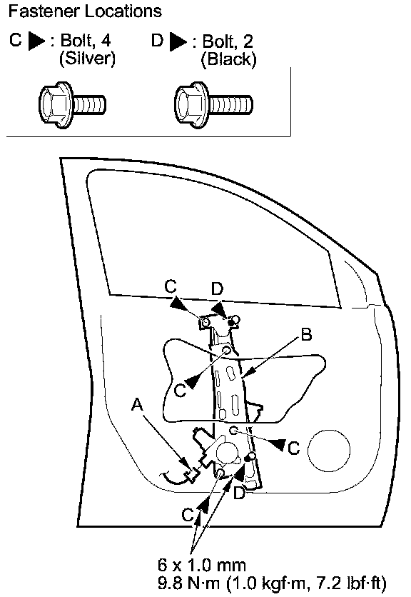6. Remove the bolts (C), and loosen the bolts (D), then remove the regulator through the hole in the door.