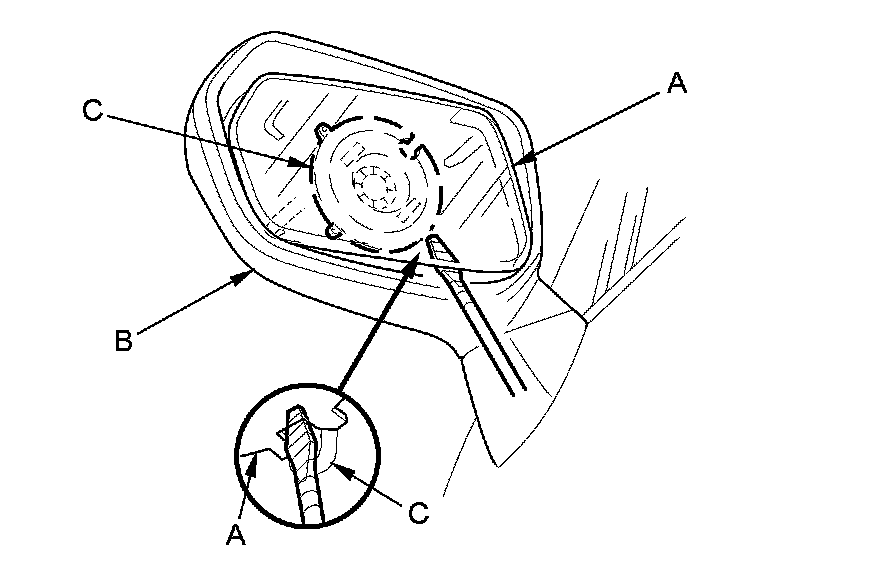 2. Insert a long thin flat-tip screwdriver in the opening between the bottom edge of the mirror holder (A) and the mirror housing (B). Slide the tip of the screwdriver between the mirror holder and the inner holder (C) of the actuator.