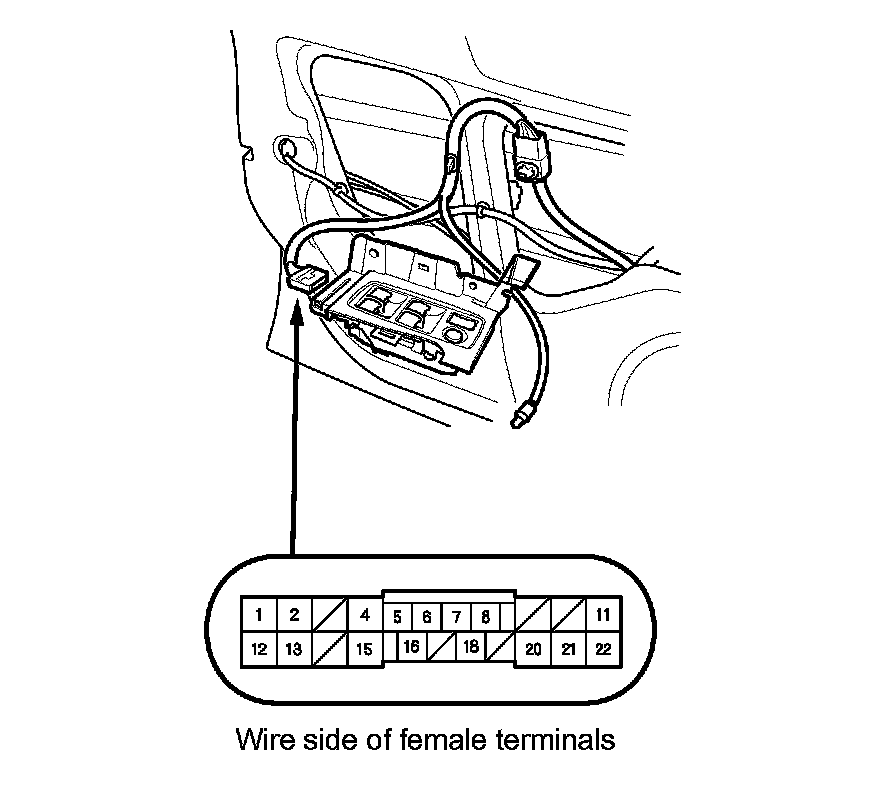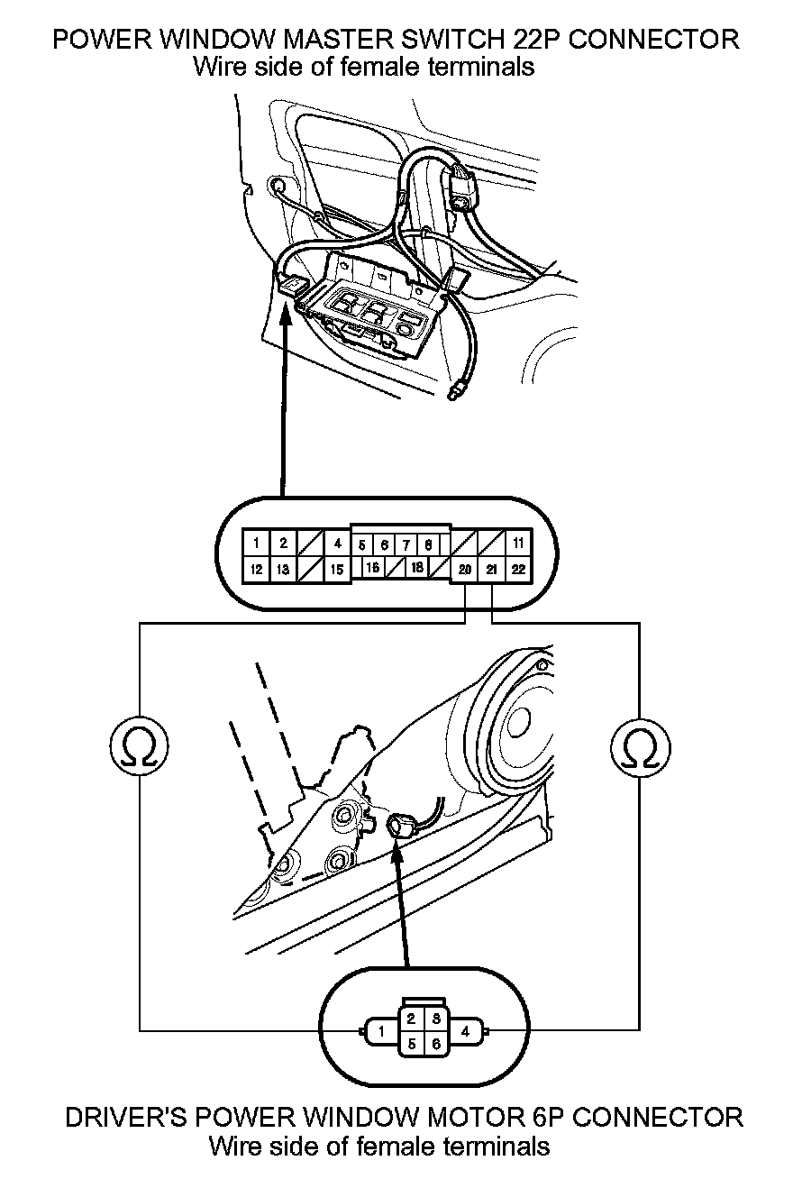 2. Test the motor in each direction by connecting battery power and ground to the power window master switch 22P connector according to the table.