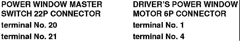 5. Check for continuity between power window master switch 22P connector terminals No. 20 and No. 21 and driver's power window motor 6P connector terminals No. 1 and No. 4 respectively.