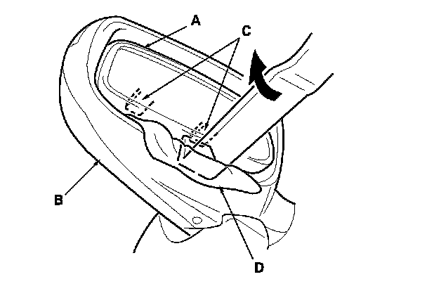 2. Insert a trim tool between the mirror holder (A) and the mirror housing (B), and then quickly twist the tool to detach the bottom clips (C). Pad the edge of the mirror housing with a shop towel (D). Take care not to scratch the mirror housing.