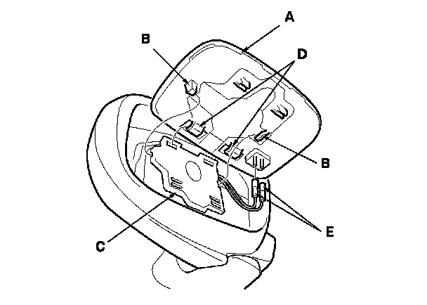 3. Carefully pull out the bottom edge of the mirror holder (A), then release the side clips (B). Separate the mirror holder from the actuator (C) by releasing the hooks (D). Disconnect the mirror defogger connectors (E) from the heater pad terminals.