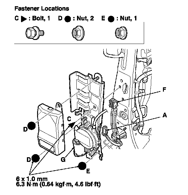 7. Disconnect the lumbar support motor connector (A), and detach the harness clip (B). Remove the bolts (C), nuts (D, E) and disconnect the ODS unit connector (F) (on passenger's seat), then remove the lumbar support motor (G).