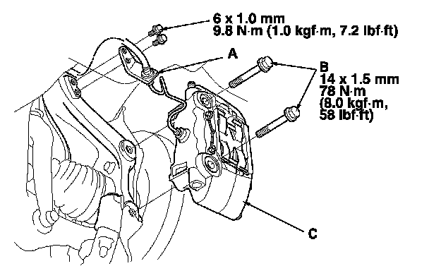 4. Remove the brake caliper bracket mounting bolts (B), and remove the caliper assembly (C) from the knuckle. To prevent damage to the caliper assembly or the brake hose, use a short piece of wire to hang the caliper assembly from the undercarriage. Do not twist the brake hose with force.