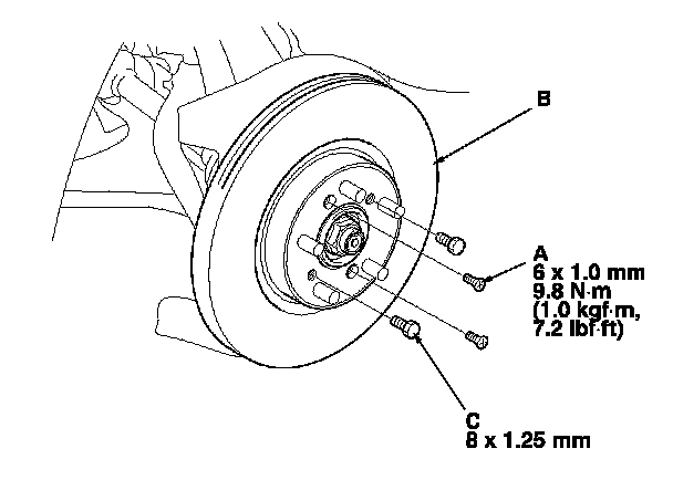 NOTE: If the brake disc is stuck to the front hub, thread two 8 x 1.25 mm bolts (C) into the disc to push it away from the hub. Turn each bolt 90 degrees to prevent the brake disc from binding.