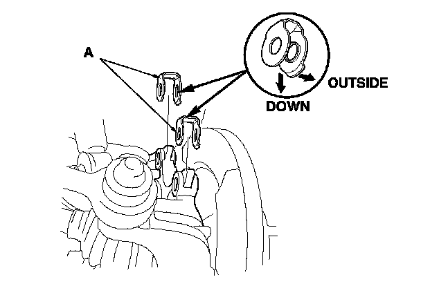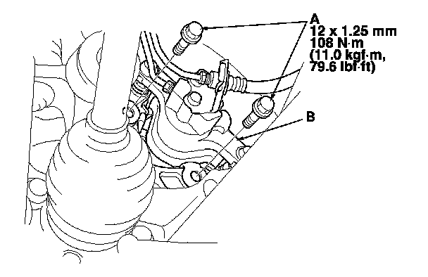 3. Remove the brake caliper bracket mounting bolts (A), and remove the caliper assembly (B) from the knuckle. To prevent damage to the caliper assembly or the brake hose, use a short piece of wire to hang the caliper assembly from the undercarriage. Do not twist the brake hose with force.