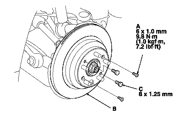 NOTE: If the brake disc is stuck to the hub bearing unit, thread two 8 x 1.25 mm bolts (C) into the brake disc/drum to push it away from the hub bearing unit. Turn each bolt 90 degrees at a time to prevent the brake disc/drum from binding.