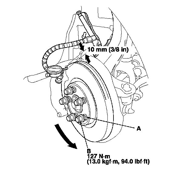 5. Install suitable flat washers (A) and the wheel nuts (B), and tighten the wheel nuts to the specified torque to hold the brake disc securely against the hub.