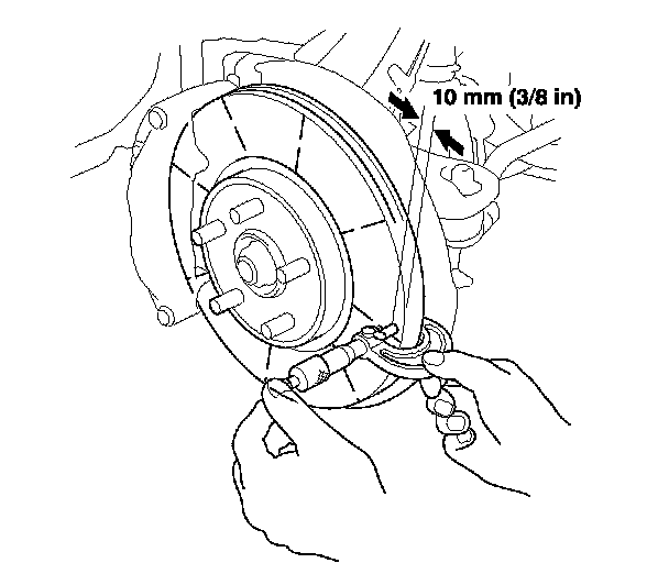 6. Set up the dial gauge against the brake disc as shown, and measure the runout at 10 mm (3/8 in) from the outer edge of the brake disc.