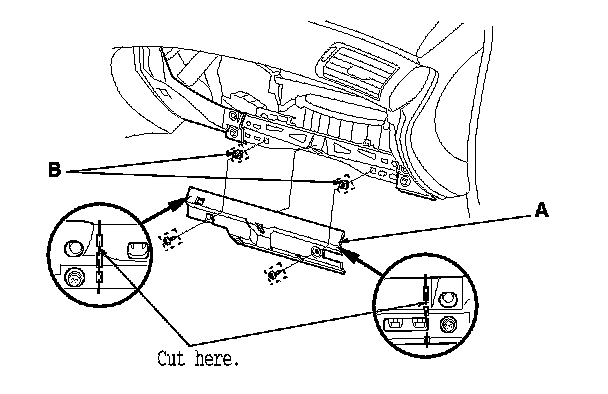 4. Cut the plastic cross brace (A) in the glove box opening with diagonal cutters in the area shown. Retain the plastic cross brace to be reinstalled later.