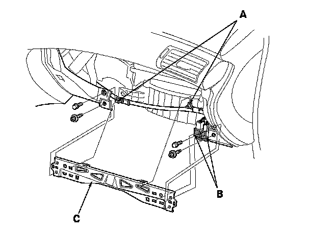5. Remove the wire harness clips (A) and the connector clips (B). Remove the bolts and the glove box frame (C).