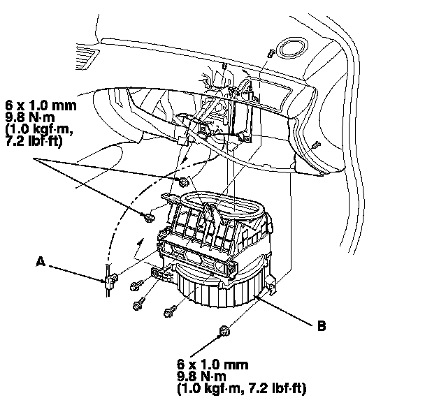 7. Disconnect the connector (A) from the recirculation control motor. Remove the mounting nuts, the bolts, and the blower unit (B).