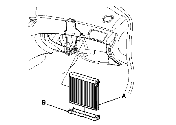 7. Carefully pull out the evaporator core (A) and the plate (B).