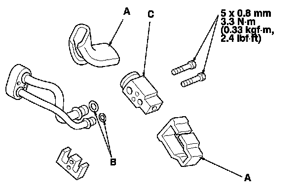 6. Remove the seals (A), the bolts, the O-rings (B), and the expansion valve (C) without bending the pipe.