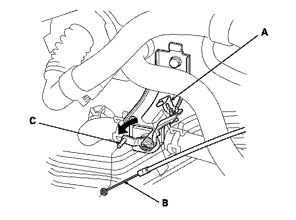 3. From under the hood open the cable clamp (A), then disconnect the heater valve cable (B) from the heater valve arm (C). Turn the heater valve arm to the fully opened position as shown.