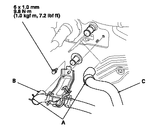 5. Slide the hose clamps (A) back. Remove the bolt and the water valve bracket, then disconnect the inlet heater hose (B) and the outlet heater hose (C) from the heater unit.