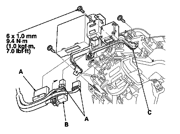10. Disconnect the connectors (A) from the blower motor, the power transistor, the control motor relay, the throttle actuator control module subharness, and the dashboard wire harnesses. Remove the self-tapping screw (B), the connector clip (C) and the wire harness clips (D).