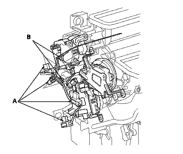 9. Disconnect the connectors (A) from the driver's cool vent control motor, the driver's air mix control motor, the mode control motor, and the evaporator temperature sensor, then remove the wire harness clips (B).