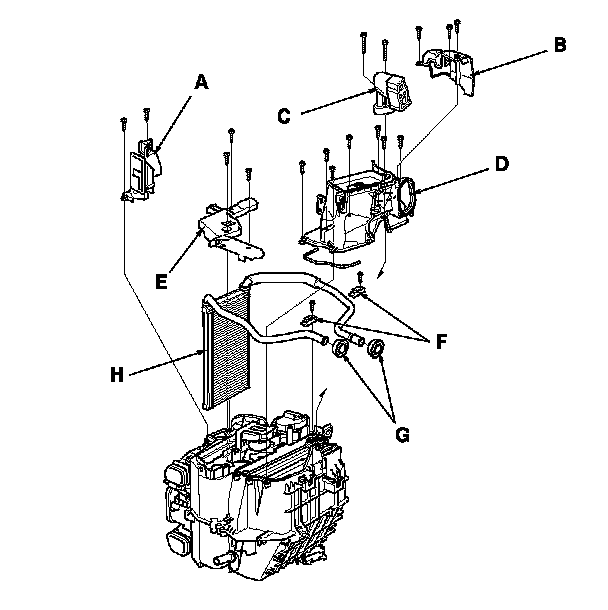 13. Remove the self-tapping screws and the passenger's heater duct (A), then remove the expansion valve cover (B), the bolts, and the expansion valve (C). Remove the self-tapping screws, the joint duct (D), and the heater core cover (E). Remove the self-tapping screws, the heater pipe brackets (F), and the grommets (G), then carefully pull out the heater core (H).