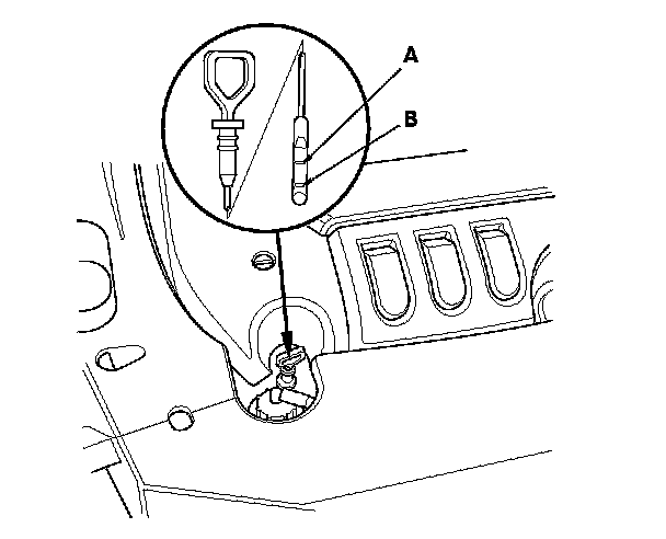 3. Remove the dipstick, and check the engine oil level. It should be between the upper mark (A) and lower mark (B).