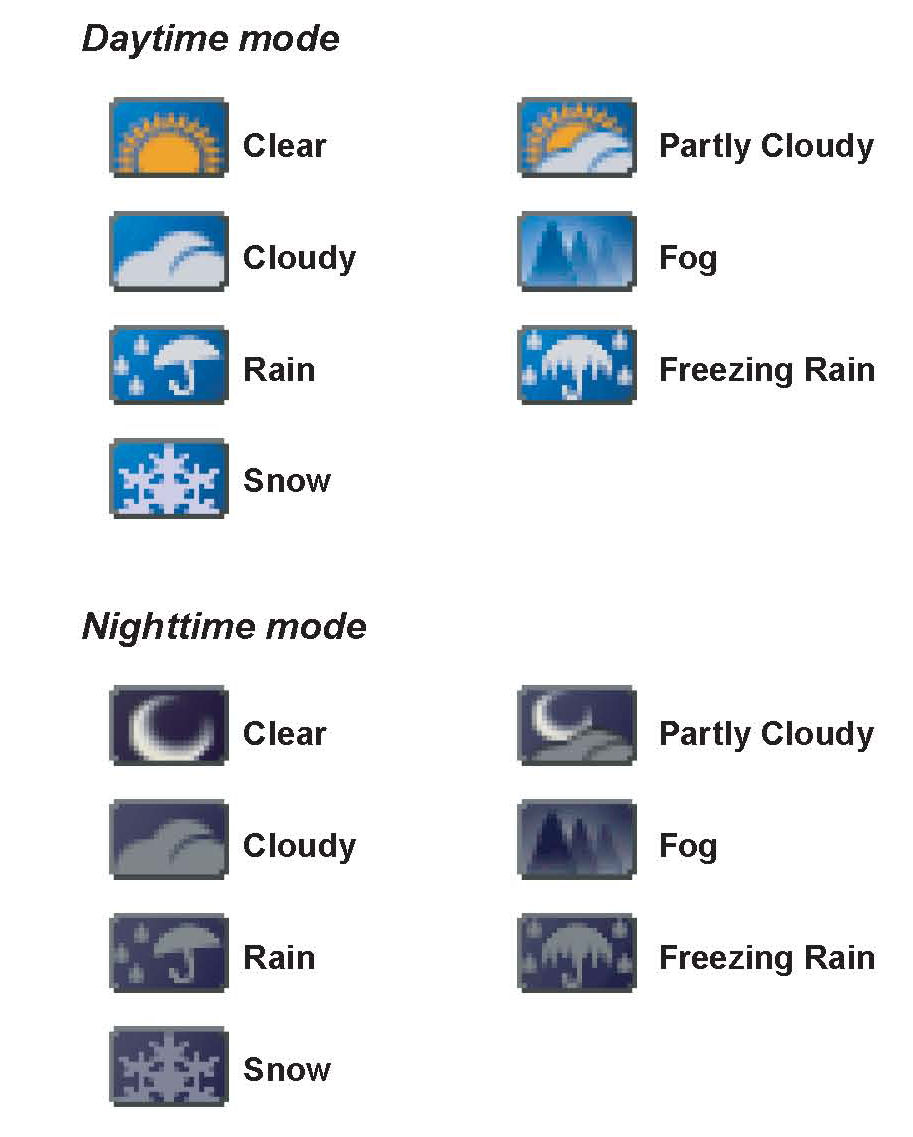 AcuraLink Real-Time Weather shows current local weather as weather icons on the map screen. These are different from weather related traffic incident icons. The weather icons are: