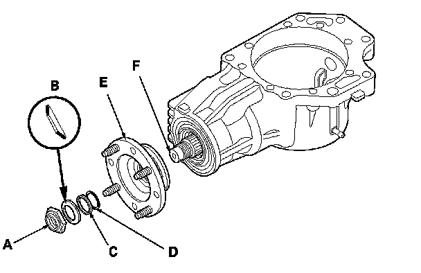 9. Remove the locknut (A), conical spring washer (B), back-up ring (C), O-ring (D), and companion flange (E) from the transfer output shaft (hypoid gear) (F).