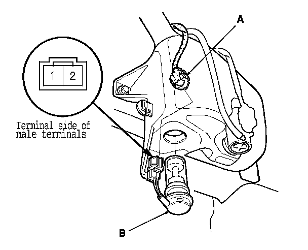 2. Disconnect the 2P connector (A) from the washer fluid level switch (B).