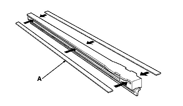 5. Examine the new wiper blades. If they have no plastic or metal reinforcement (A), remove the metal reinforcement strips from the old wiper blades, and install them in the slots along the edge of the new blade.
