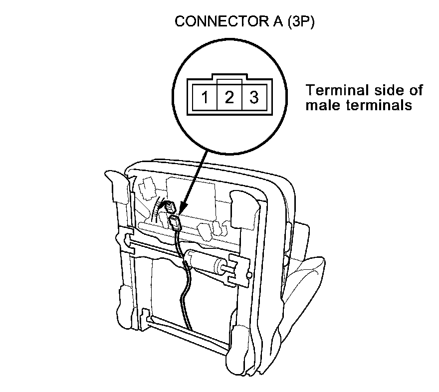 8. Check for continuity between seat heater connector A (3P) terminals No. 1 and No. 3, and terminals No. 2 and No. 3. There should be continuity.