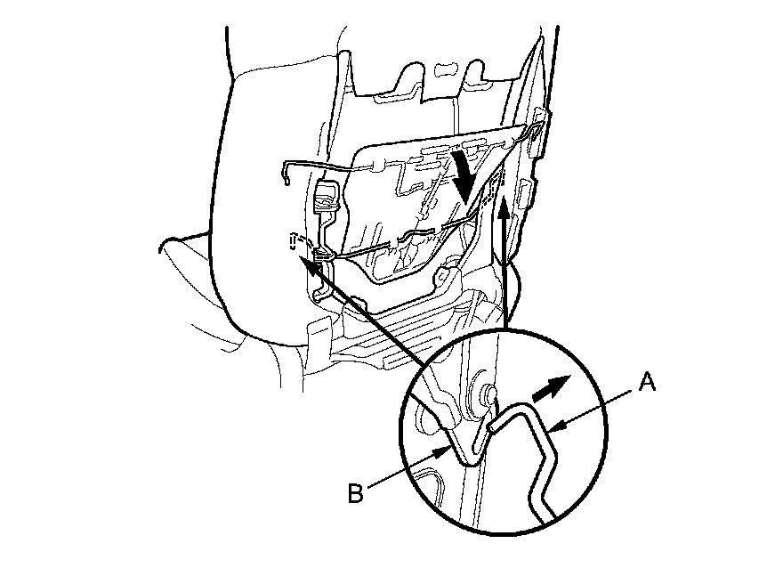 6. Release the lower wires (A) from both active head restraint links (B) inside the seat-back.