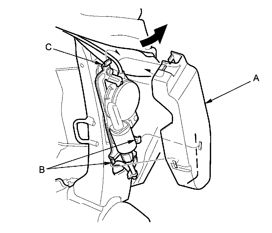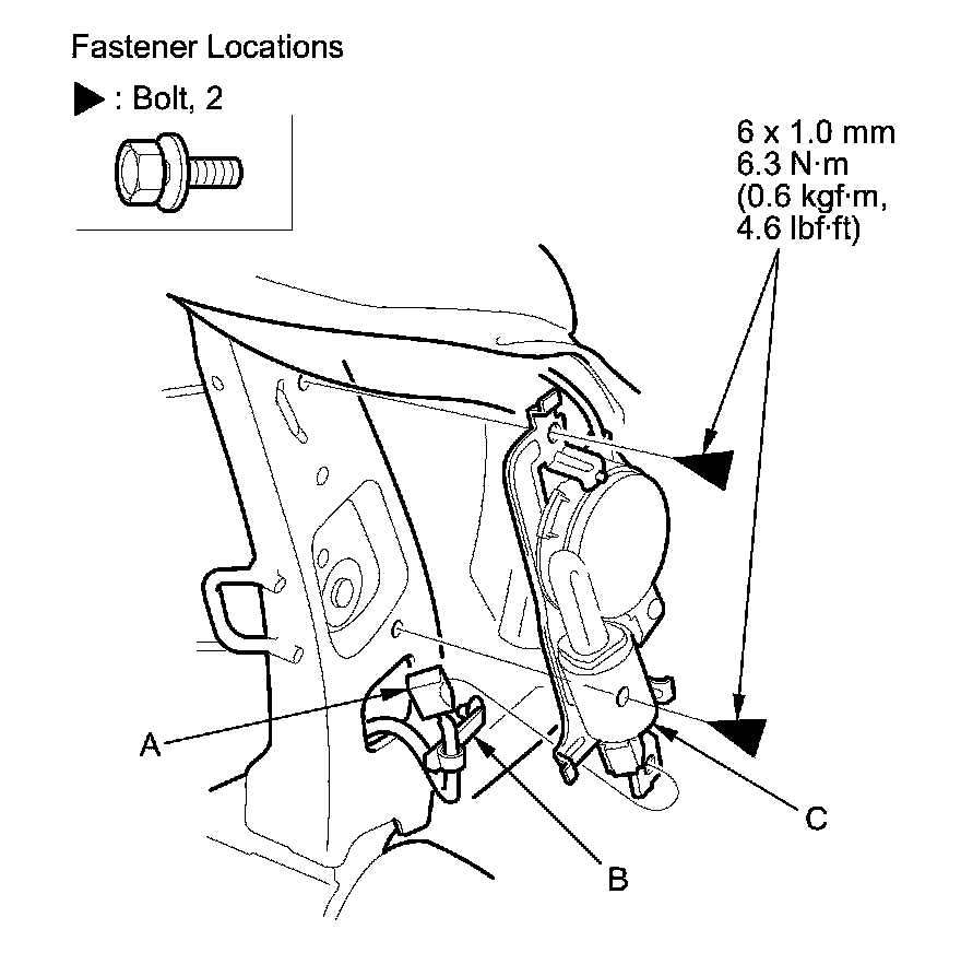 8. Disconnect the lumbar support motor connector (A), and detach the harness clip (B). Remove the bolts, and separate the lumbar support motor (C) from the seat frame, then remove the lumbar support.