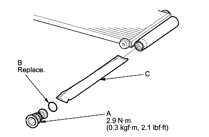 2. Remove the cap (A) from the bottom of the A/C condenser. Remove the O-ring (B) and the desiccant (C).