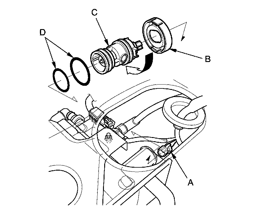6. Install the parts in the reverse order of removal with new O-rings (D) and a new cap.
