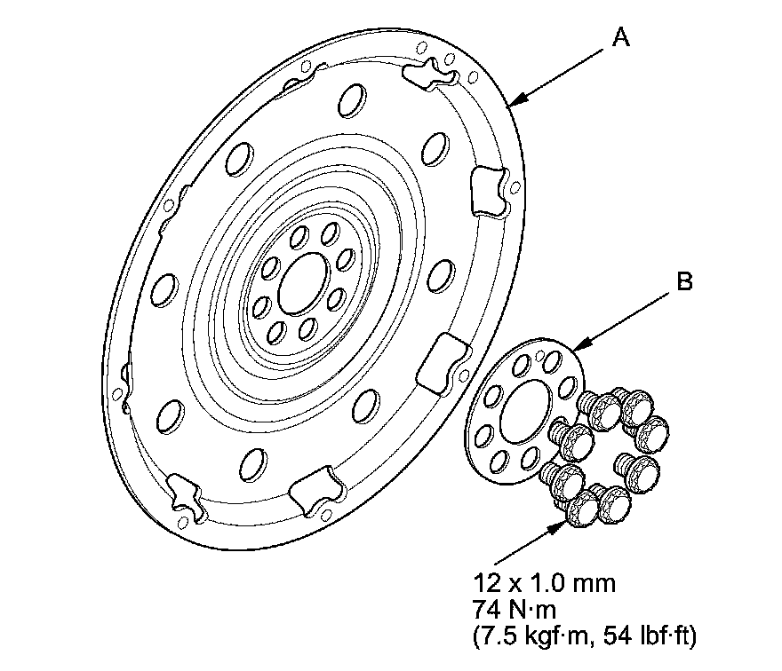 2. Remove the drive plate (A) and the washer (B) from the engine crankshaft.
