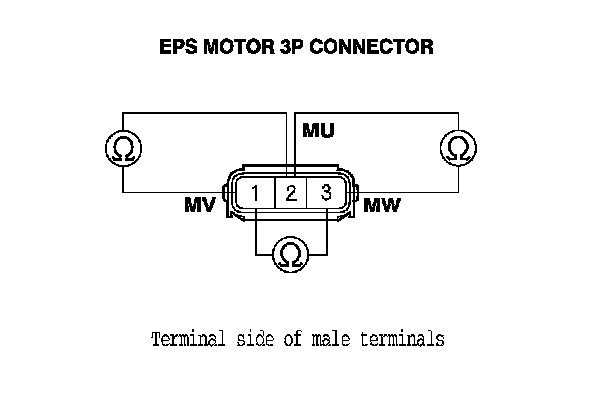 11. On the EPS motor side, check for continuity between EPS motor 3P connector terminals No. 1 and No. 2, No. 1 and No. 3, and No. 2 and No. 3 individually.