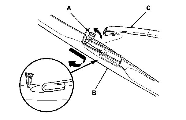 2. Pull up and hold the tab (A), and slide the wiper blade assembly (B) toward the tabs until it releases from the wiper arm (C).