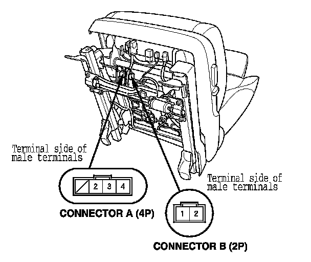 2. Disconnect the connector A (4P) and connector B (2P) from the seat heaters.